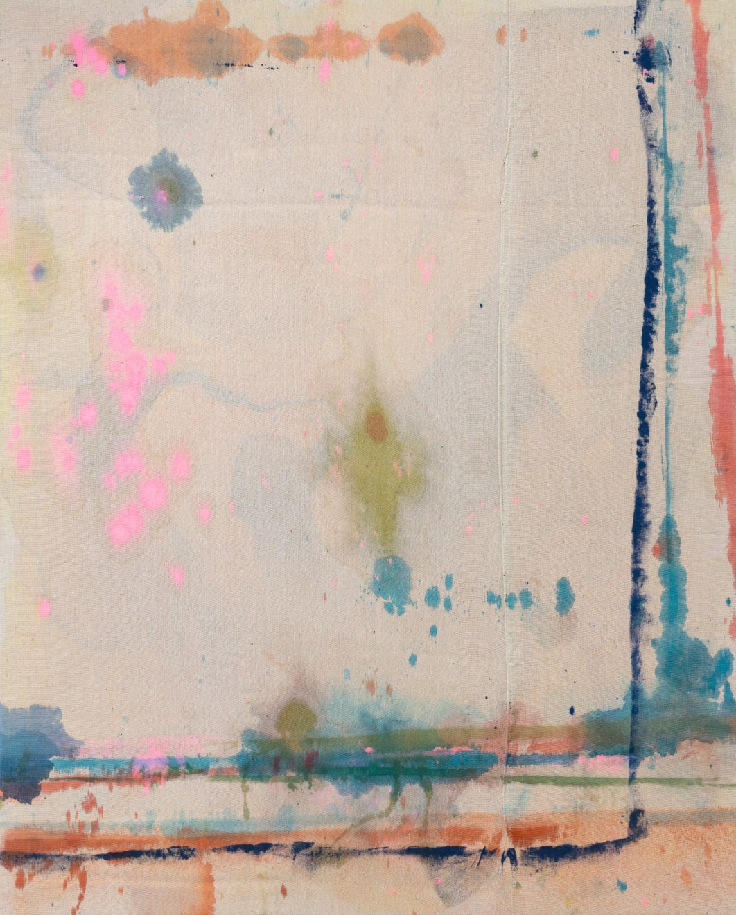 In Matt Arbuckle’s Elevated Emotion, controlled folding and staining of the polyester support produces a dreamlike, ephemeral image, seemingly dissolving and precipitating at the same time. This work is also, in a real sense, a palimpsest or trace; Arbuckle employs the pooling of the paint against the corrugated cardboard protecting the surface on which it was made as a mark-making tool. His paintings thus directly incorporate the lived time of artmaking and the space of the studio, each their own autobiography. Here, as in many of Arbuckle’s works, there seems to be a narrative component, a sense of a lived-in space, experienced and remembered simultaneously. As well as being a trace or vestige of the inhabited studio, Arbuckle’s painting is also a landscape of a sort. Fragile tissues of colour frame a visceral stained mark, creating an eerie, ethereal dreamscape that invites a meditative experience of time.